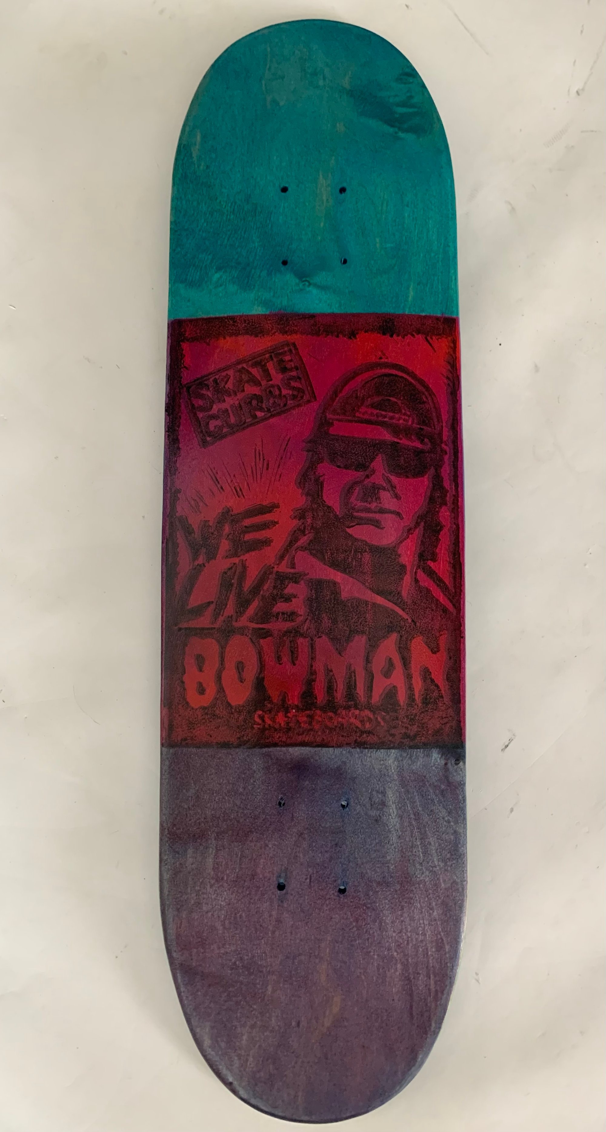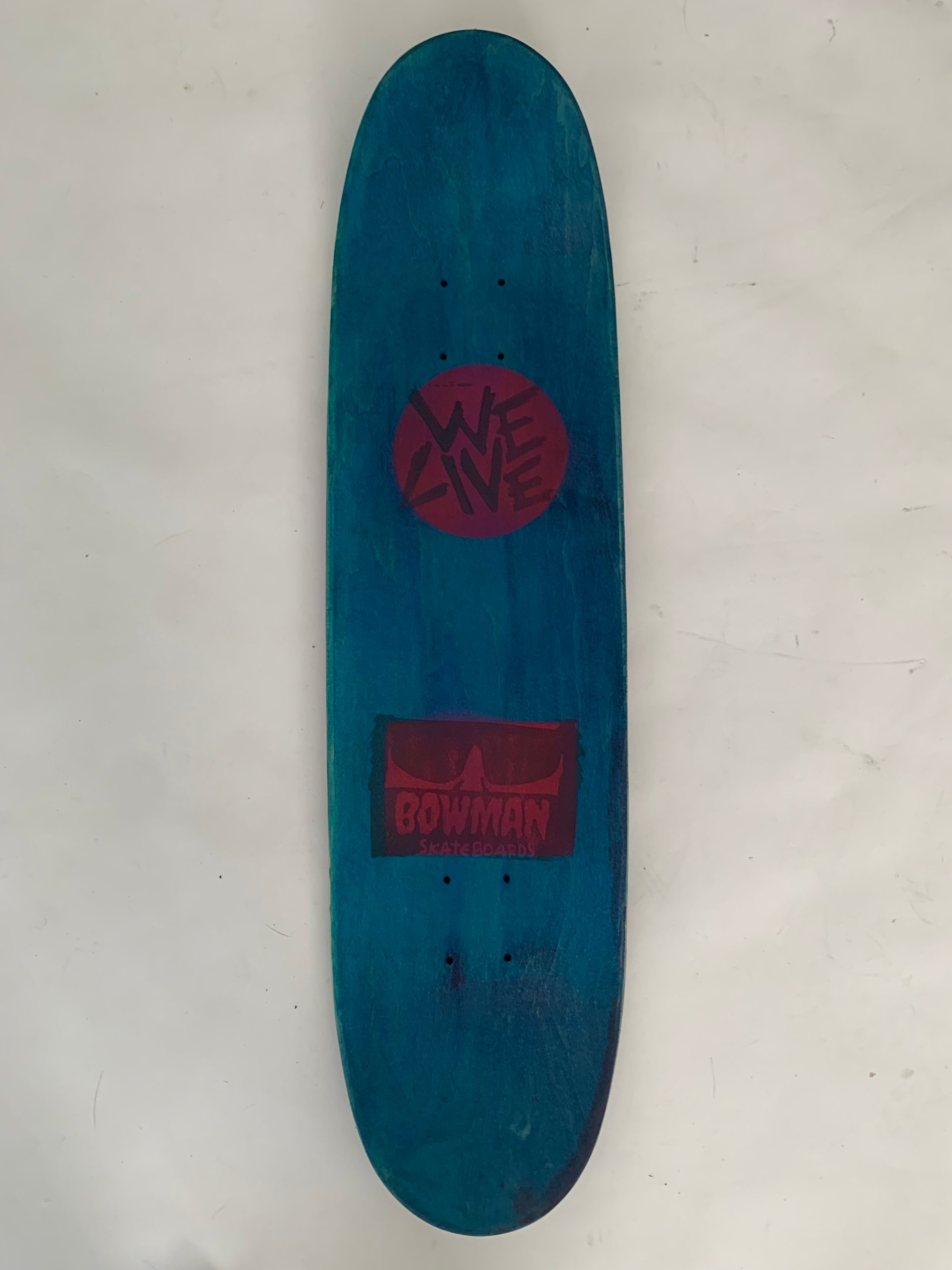 Hand crafted Egg shape, tapers from 8.5" to 8.125" over trucks and 31.75" long. We Live graphic original art by Matt Bowman.